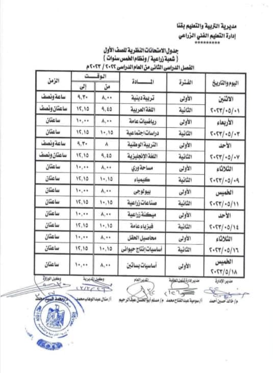 جدول امتحانات الصف الأول الثانوي الزراعي الترم الثاني 2023 محافظة قنا