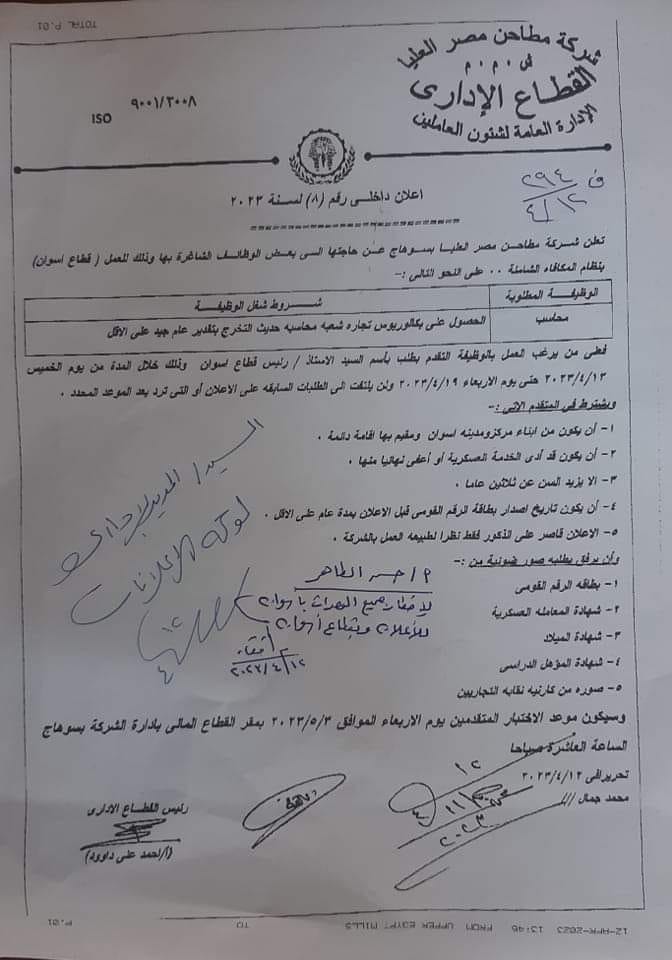جاءت المستندات المطلوبة لوظائف محاسبين بمطاحن مصر العليا بقطاع أسوان كالتالي: