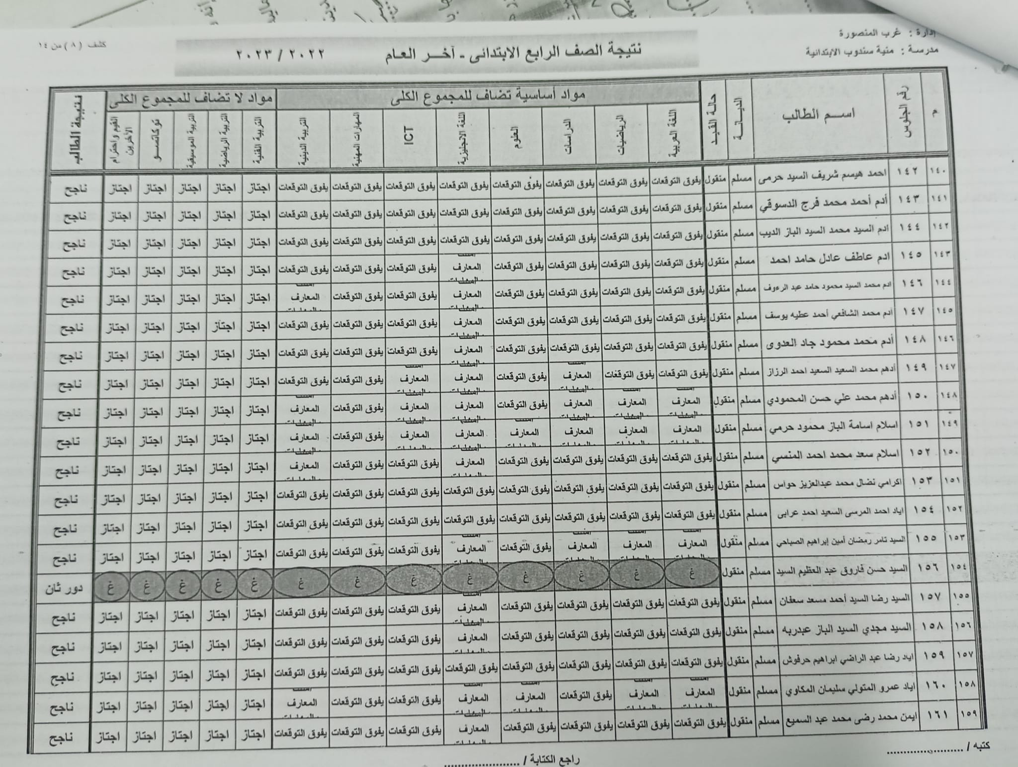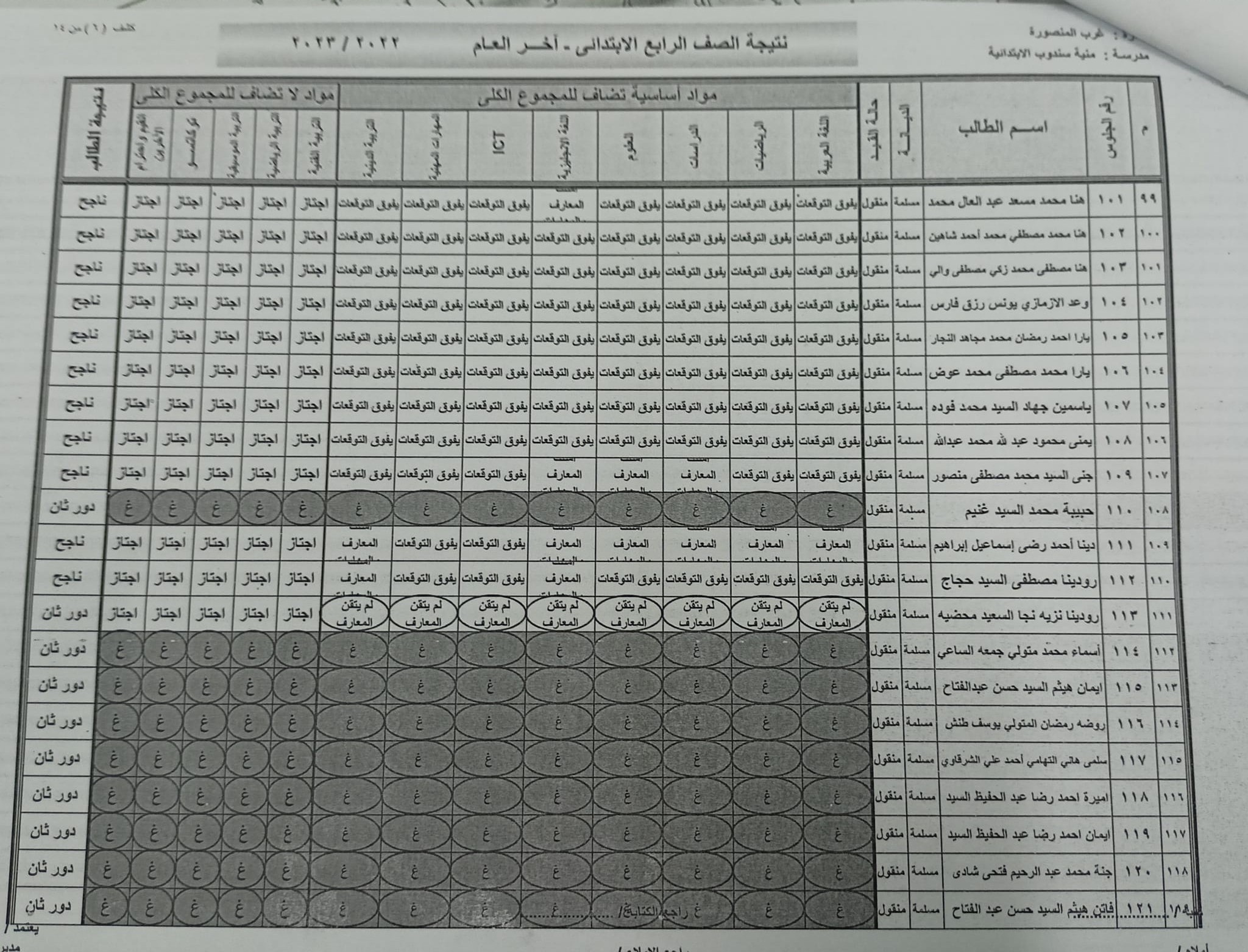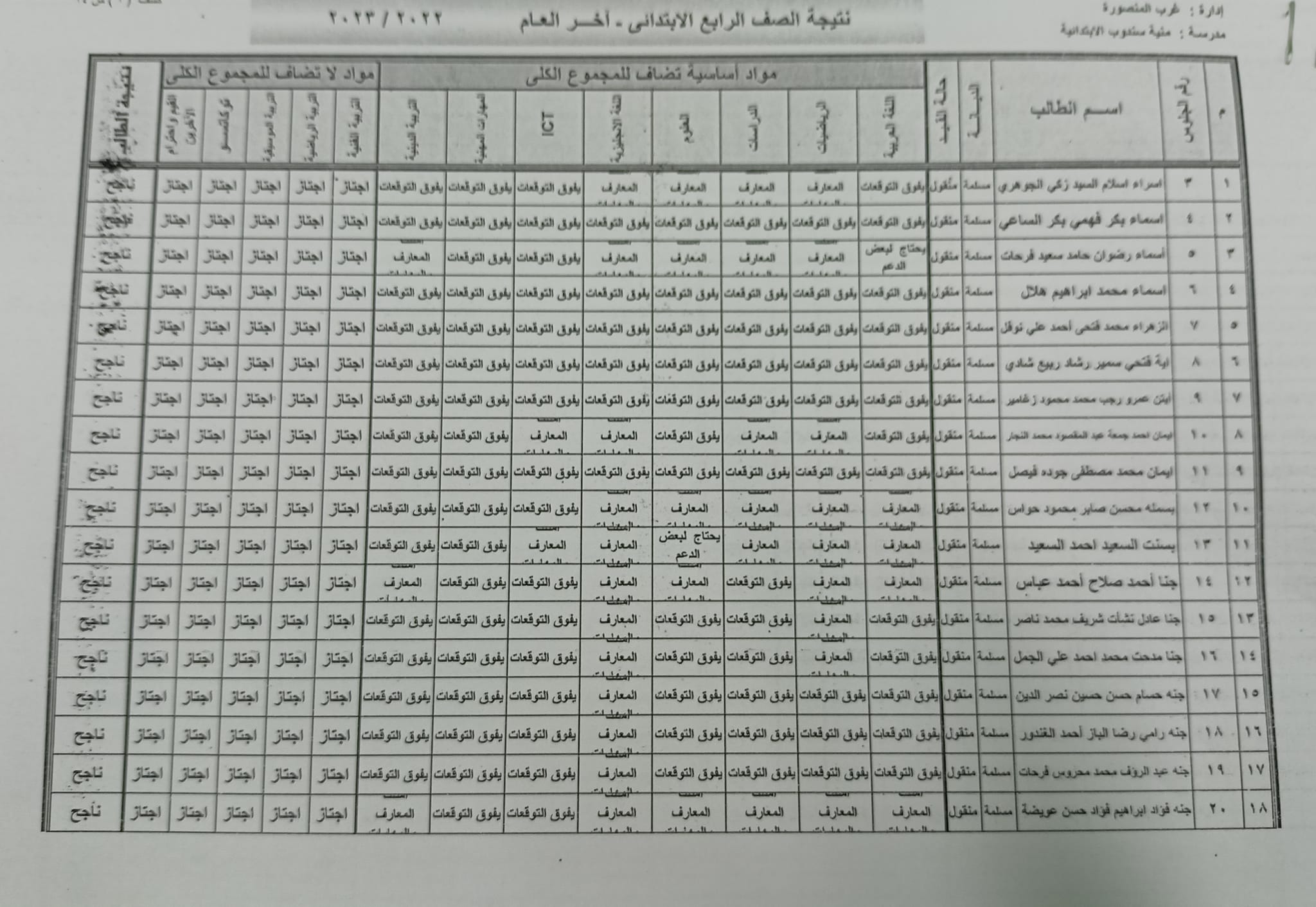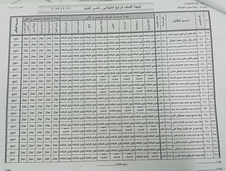 ومن المقرر أن تعلن نتائج الصف الرابع الابتدائي عبر المدارس أو في الإدارات التعليمية، وقد جاءت نتائج الصف الرابع الابتدائي في محافظة الدقهلية كالتالي: