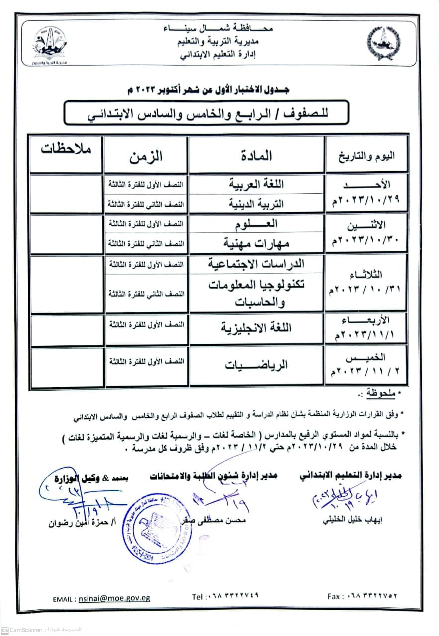 جدول امتحانات شهر أكتوبر 2023 رابعة ابتدائي شمال سيناء