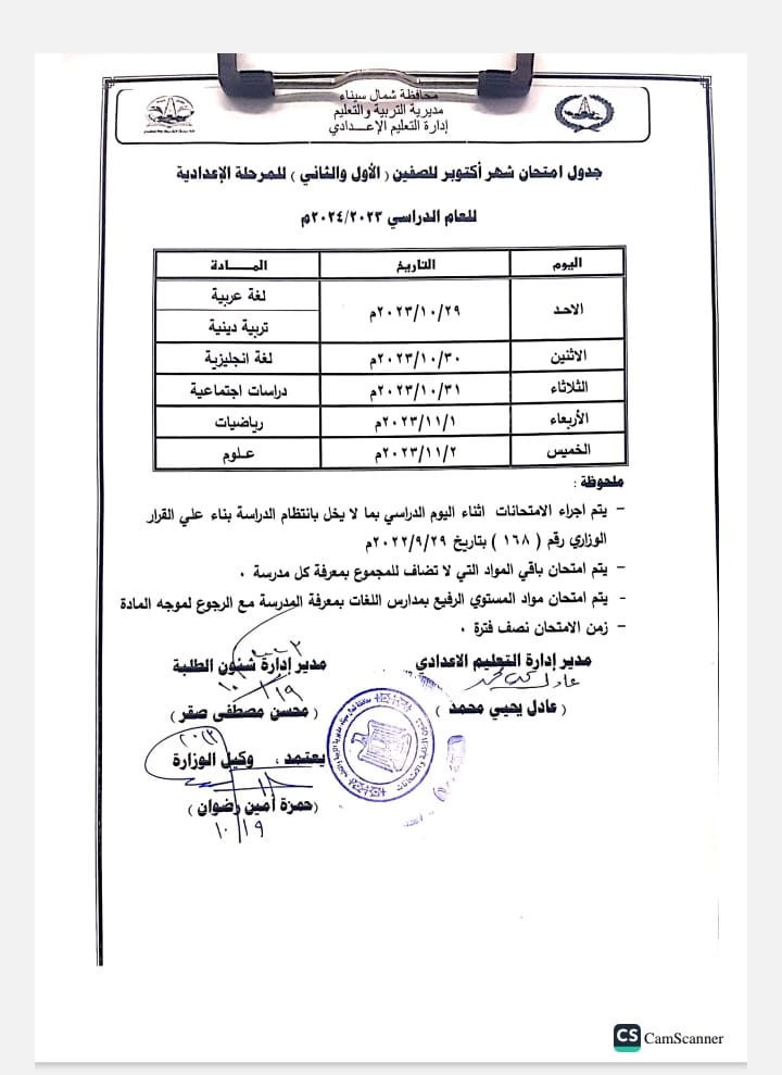 جدول امتحانات شهر أكتوبر 2023 أولى إعدادي شمال سيناء