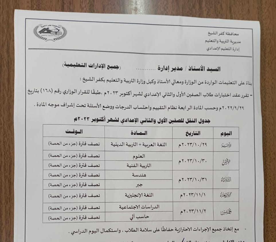 جدول اختبارات شهر أكتوبر 2023 ثانية إعدادي كفر الشيخ