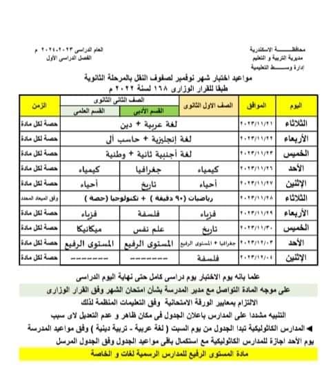 جدول امتحانات شهر نوفمبر 2023 الصف الأول الثانوي محافظة الإسكندرية