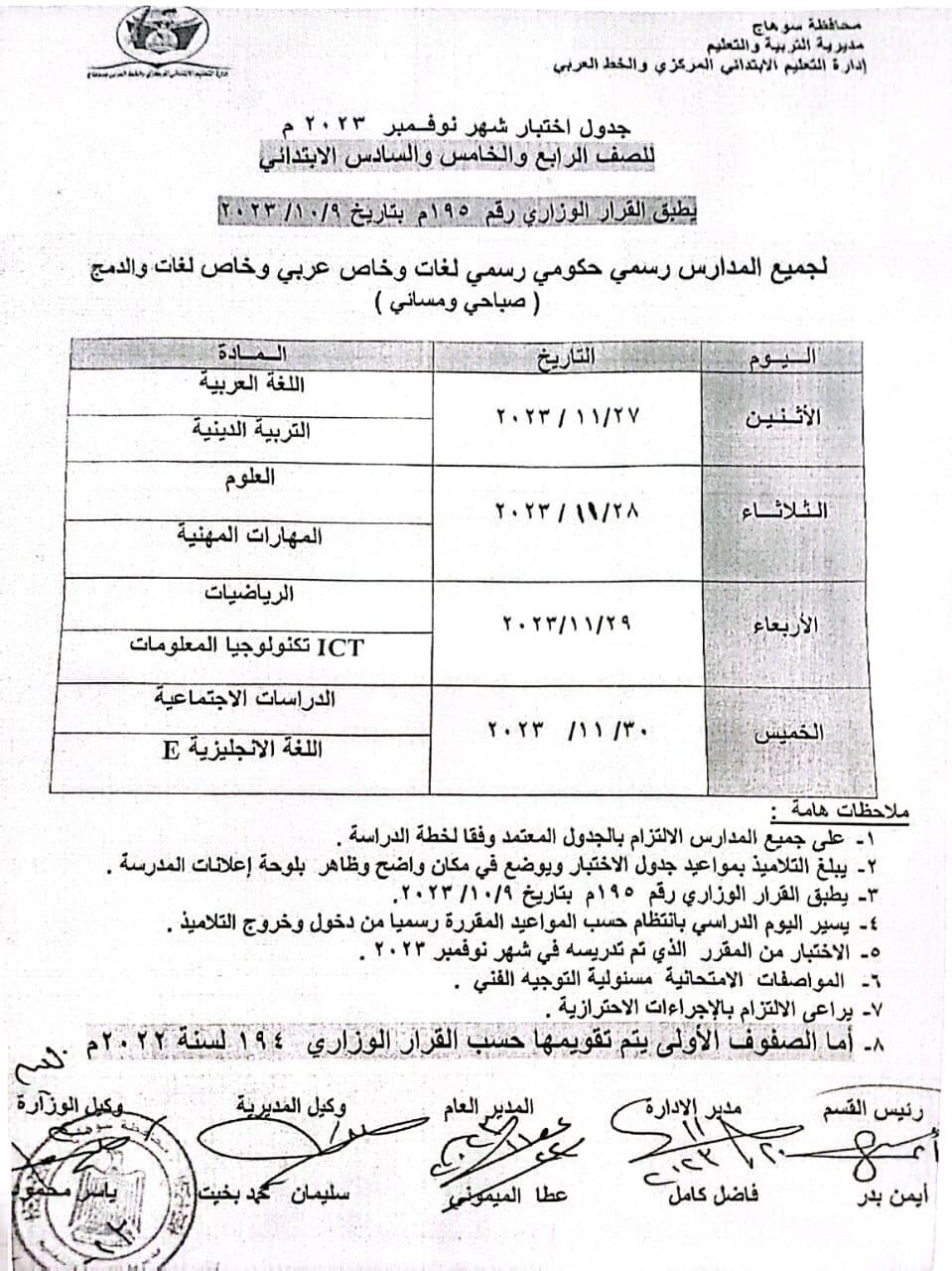 جدول امتحانات نوفمبر 2023 الصف الرابع والخامس والسادس الابتدائي سوهاج
