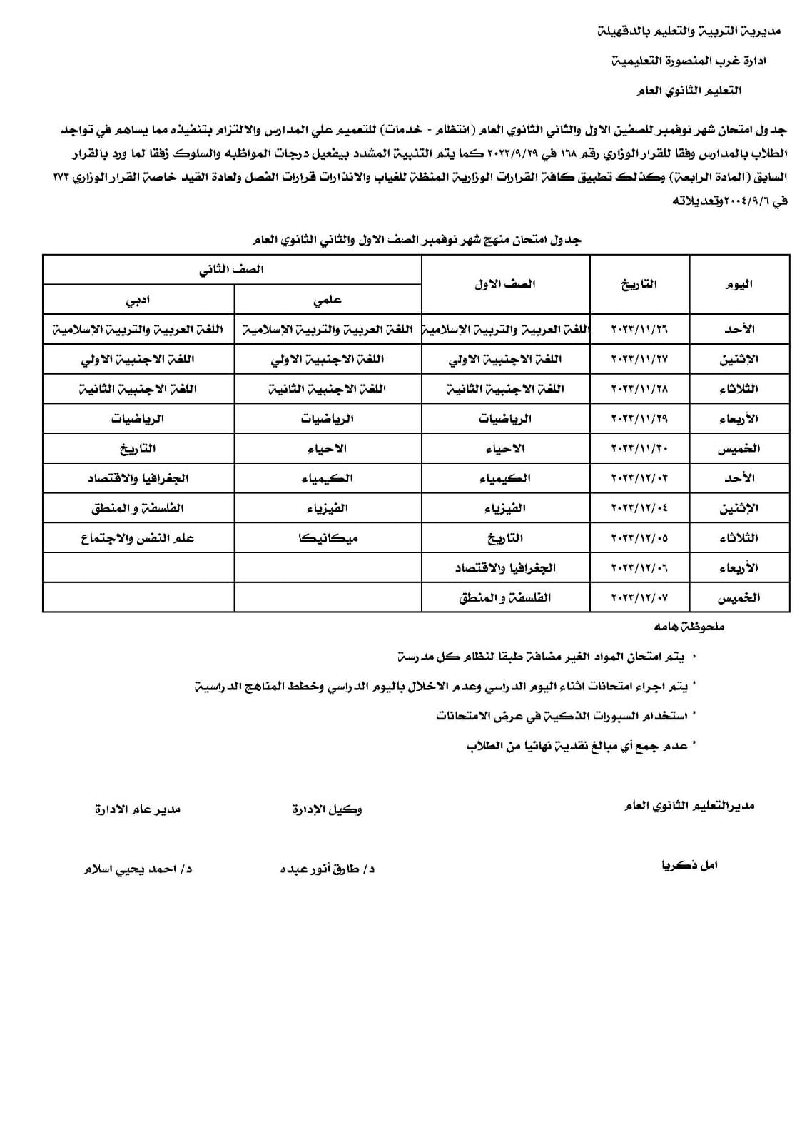 جدول امتحانات نوفمبر 2023 أولى ثانوي محافظة الدقهلية