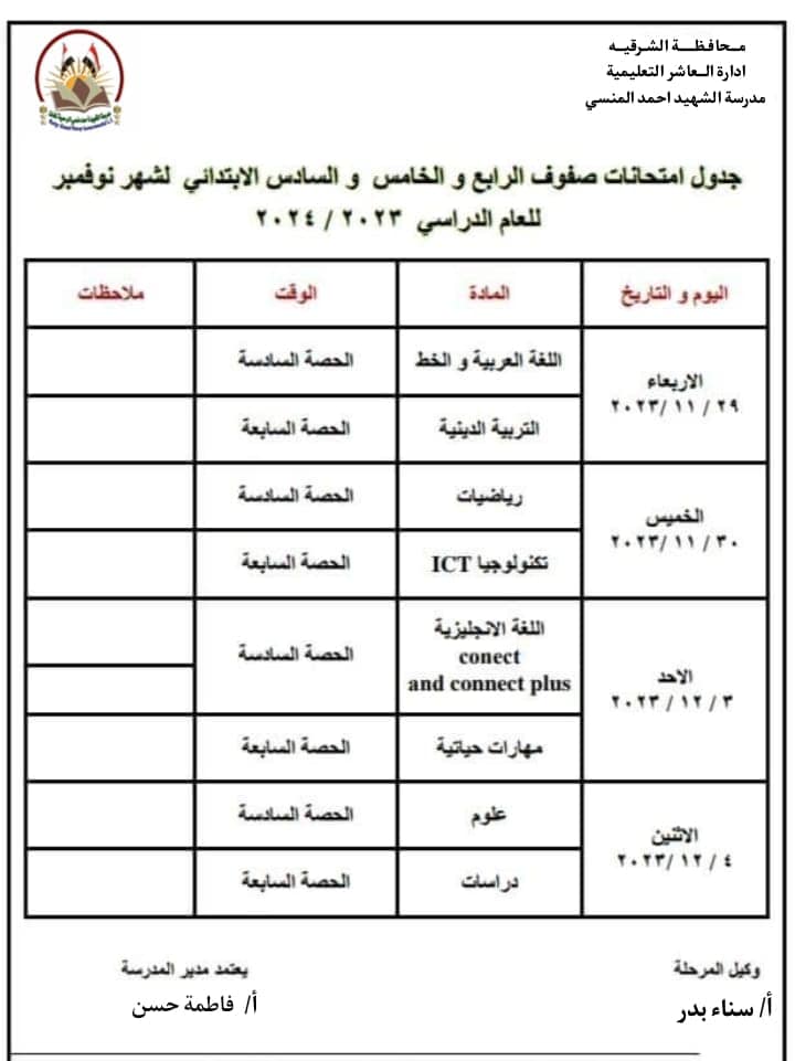 جدول امتحانات نوفمبر 2023 الصف الرابع الابتدائي الشرقية