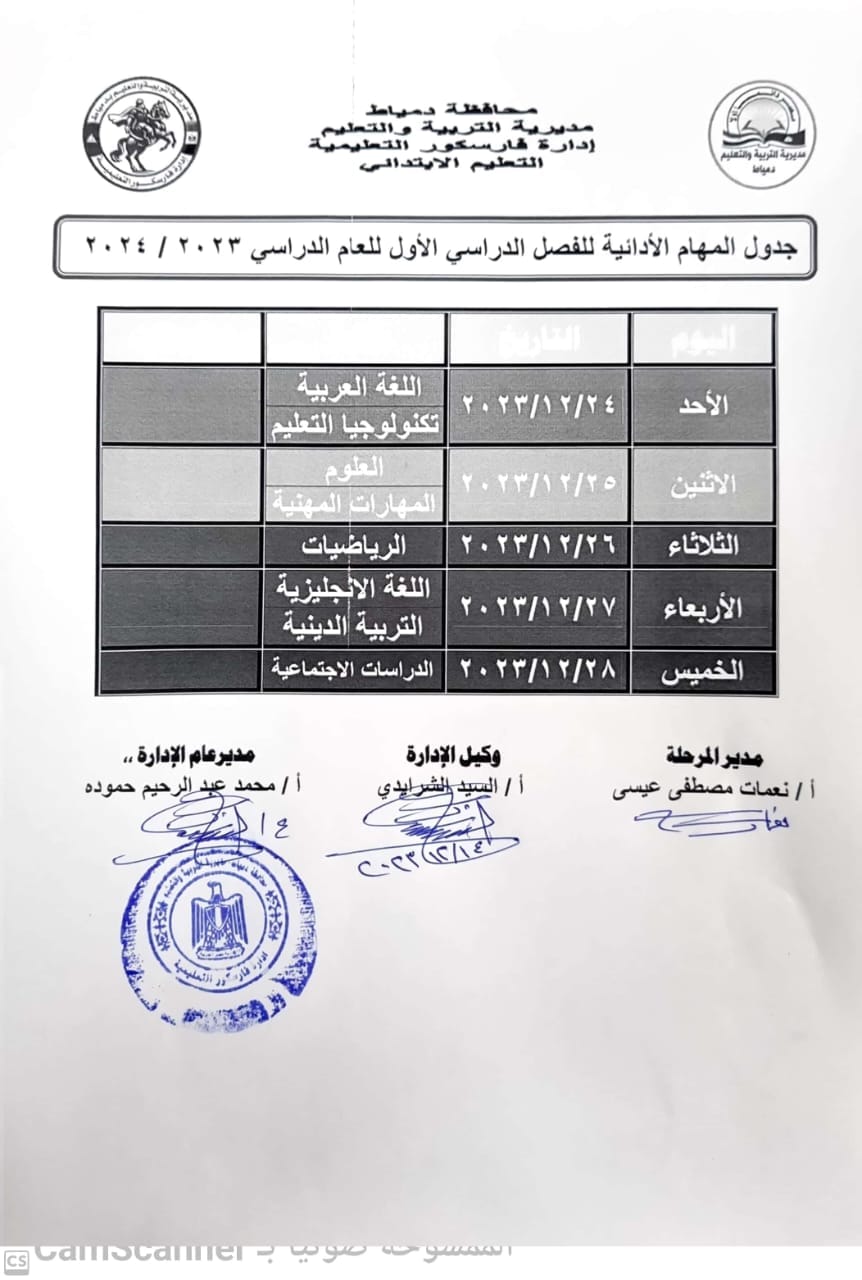جدول المهام الأدائية الترم الأول الصف الرابع والخامس والسادس دمياط 2024