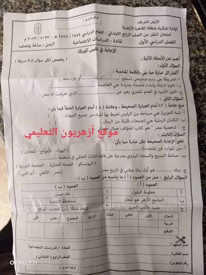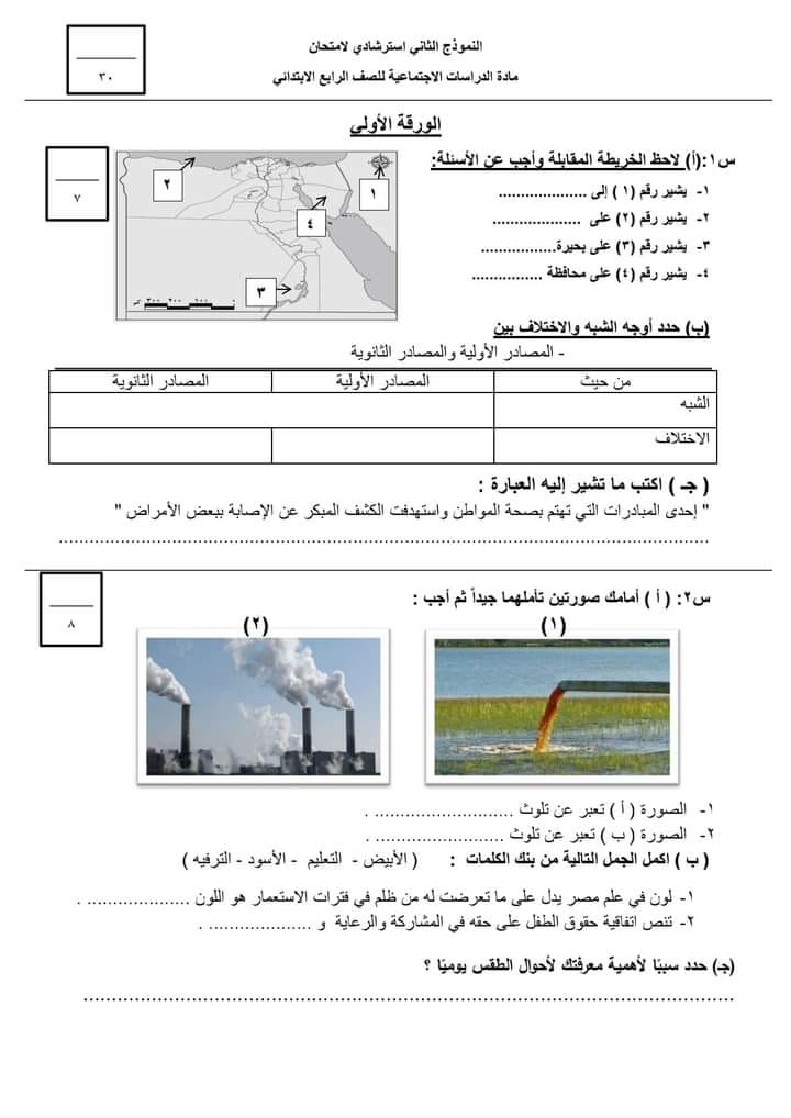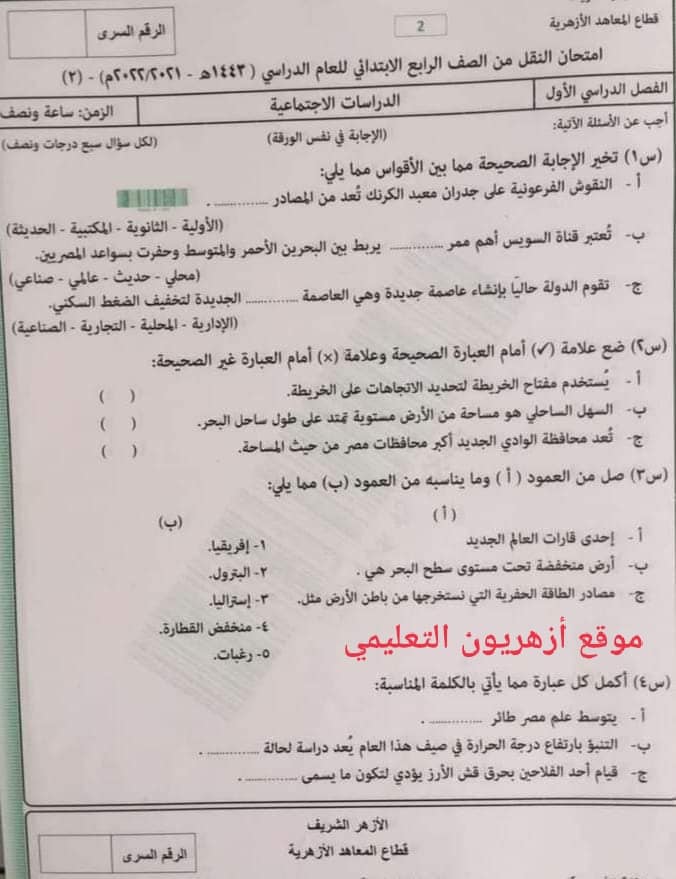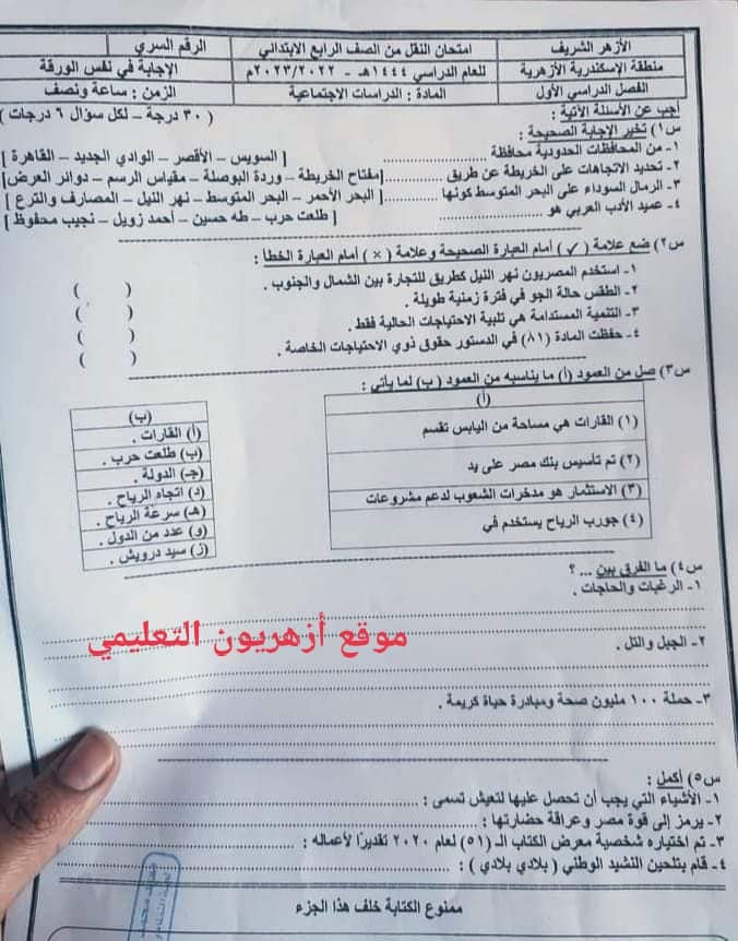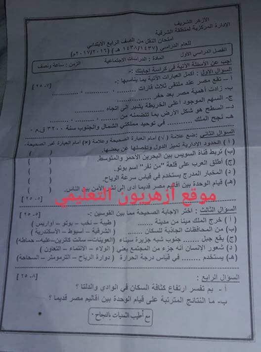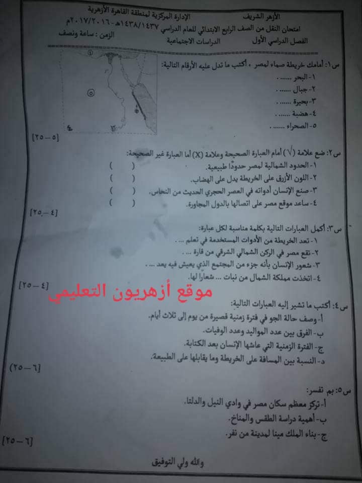 نماذج امتحانات دراسات اجتماعية رابعة ابتدائي أزهر الترم الأول