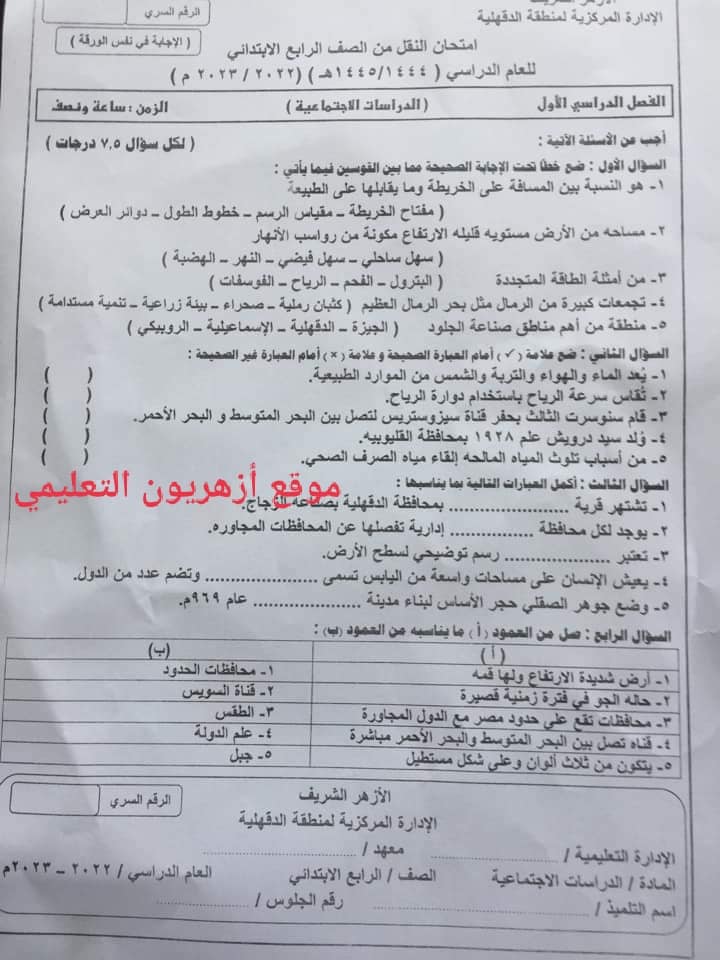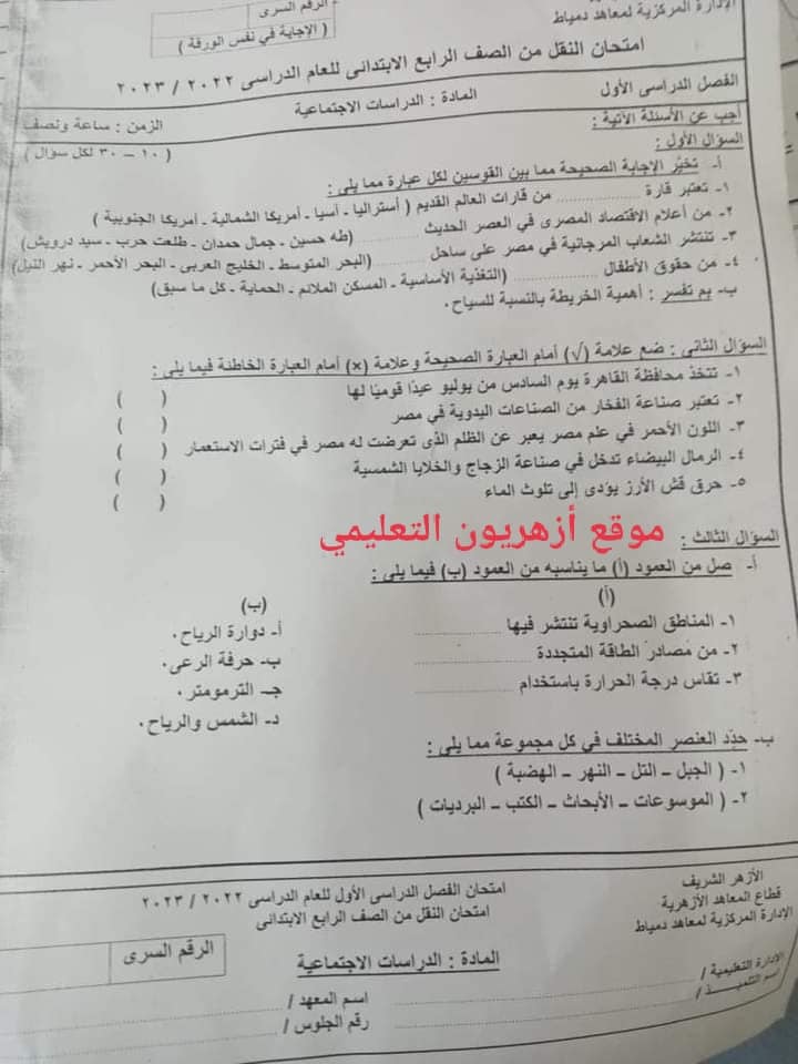 نماذج امتحانات سابقة دراسات اجتماعية الصف الرابع الابتدائي الأزهر الترم الأول