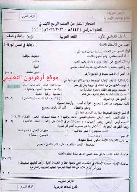 نماذج من امتحانات دراسات رابعة ابتدائي أزهر الترم الأول