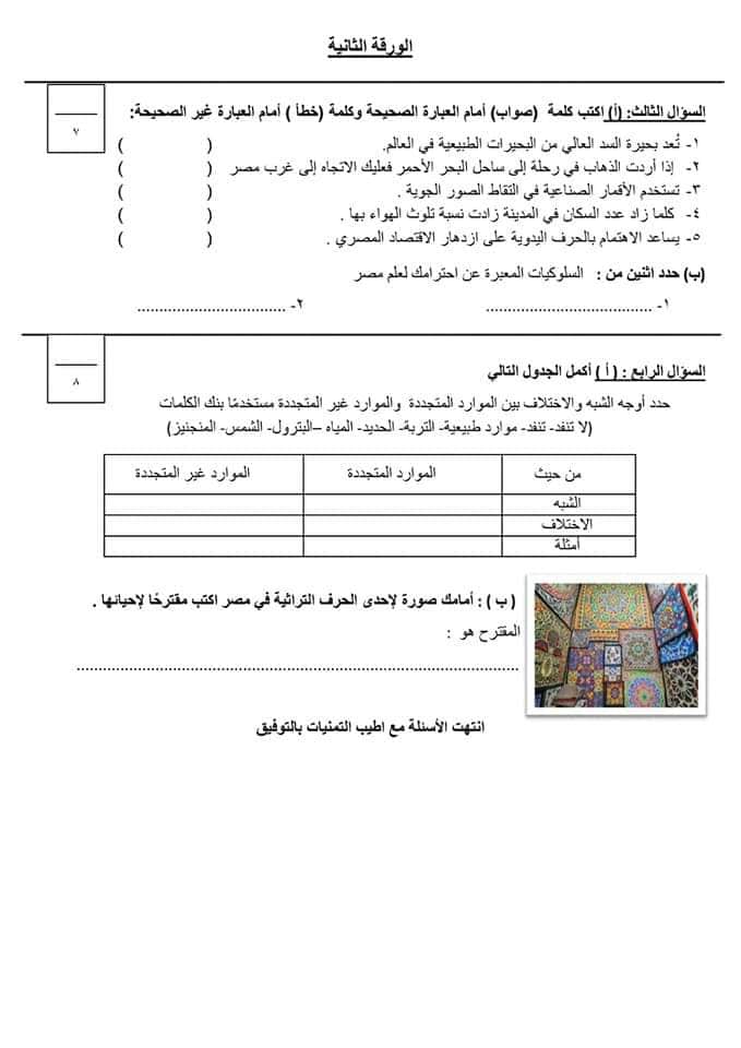 وجاءت بعض نماذج الامتحانات السابقة في مادة الدراسات الاجتماعية الصف الرابع الابتدائي الأزهر الترم الأول على النحو التالي: