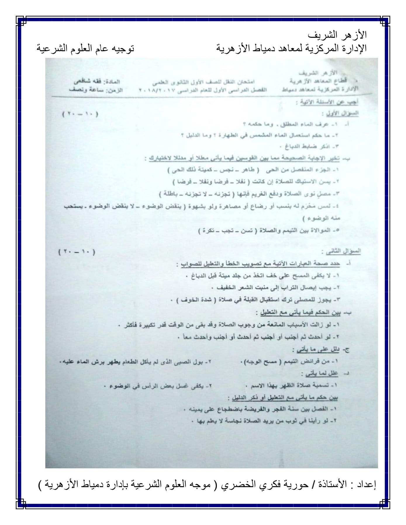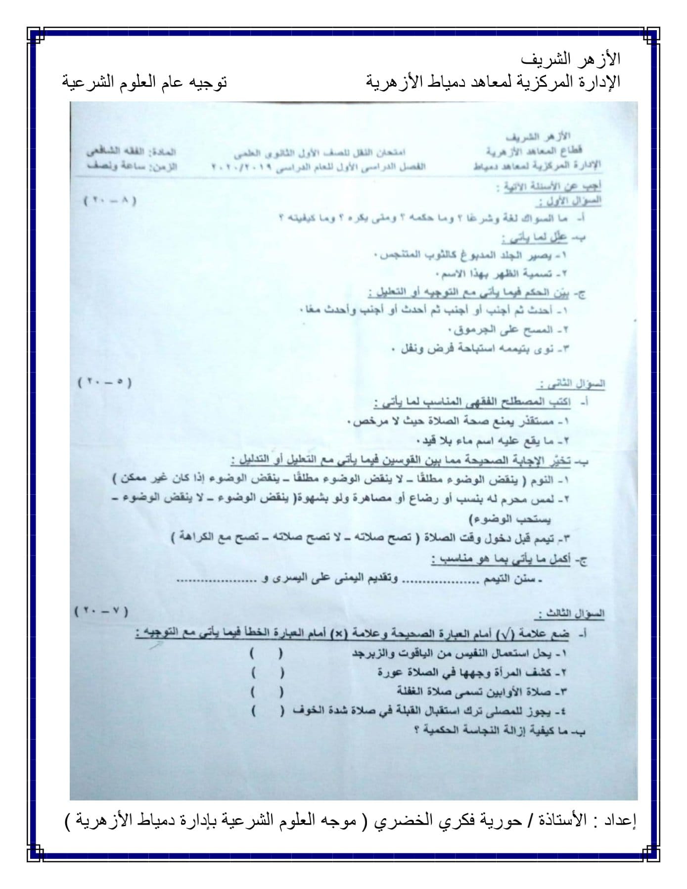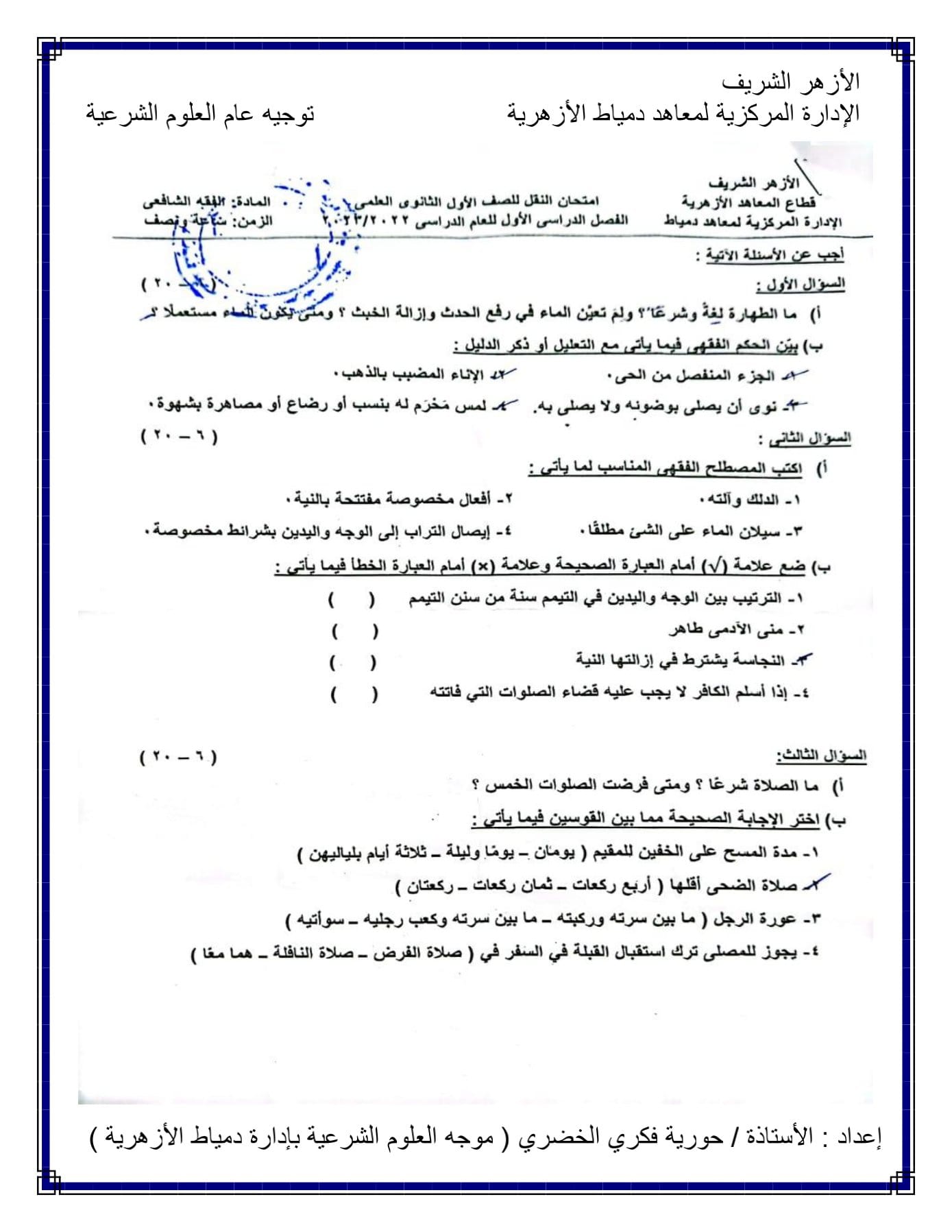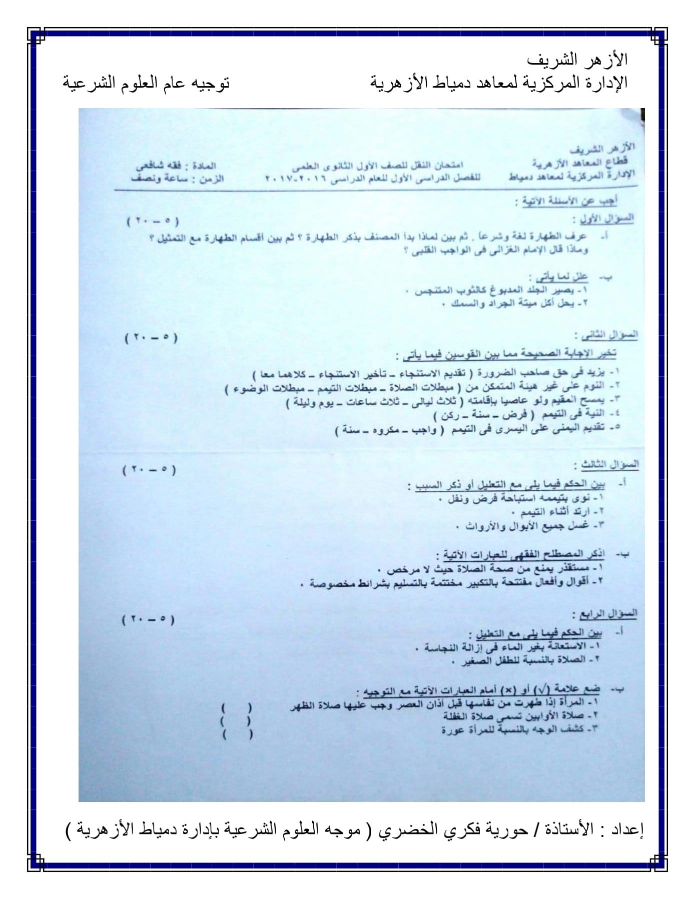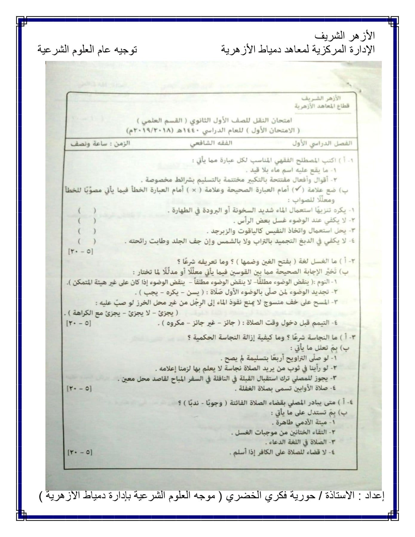 نماذج امتحانات سابقة الفقه الشافعي أولى ثانوي أزهر علمي الترم الأول