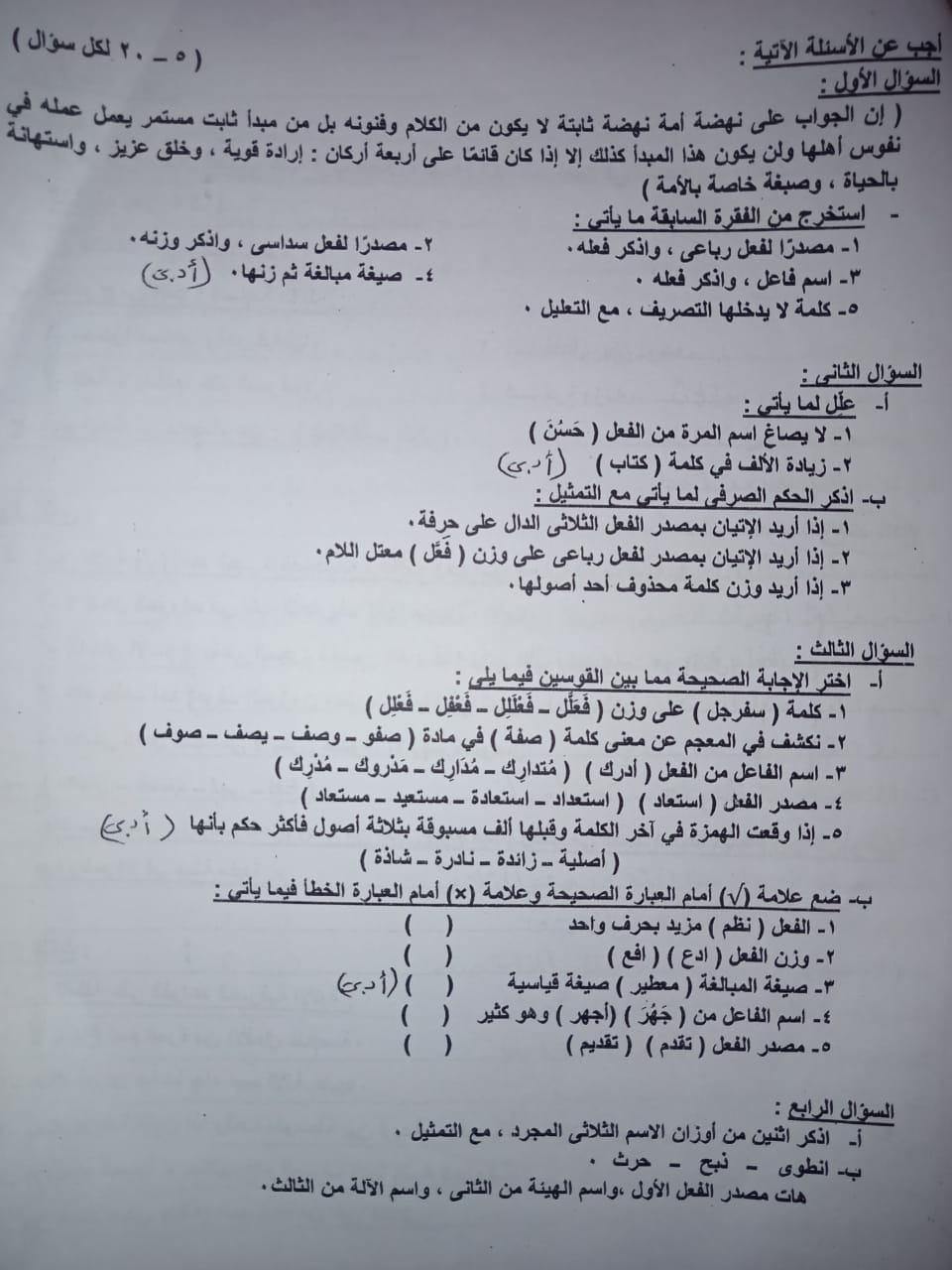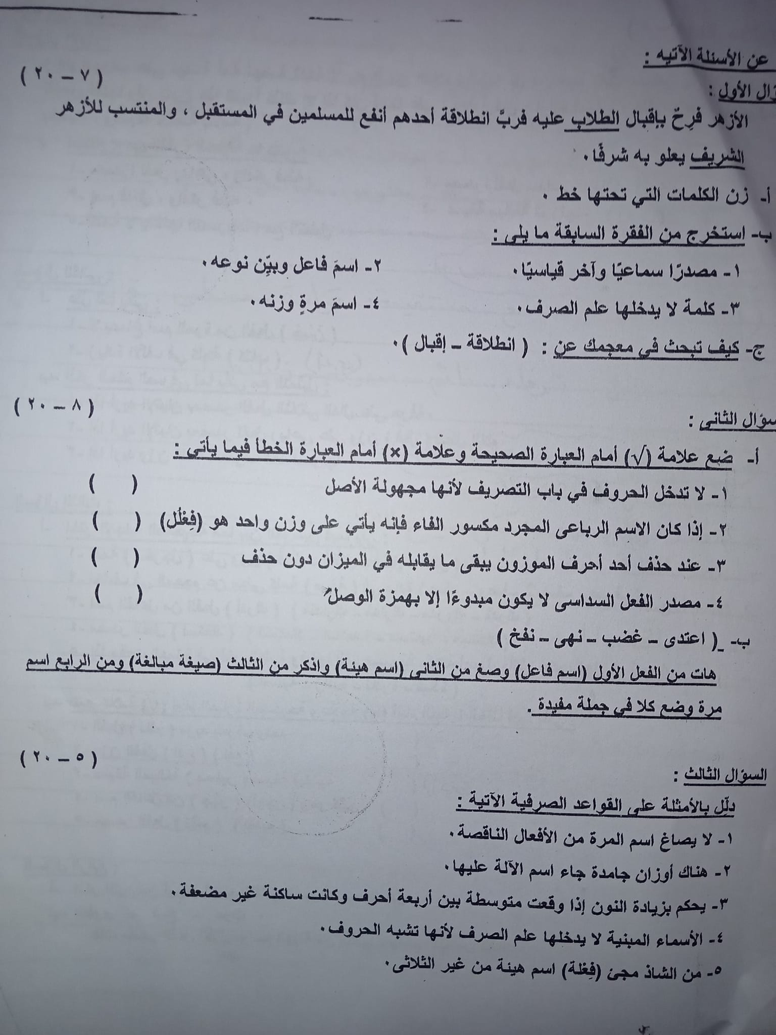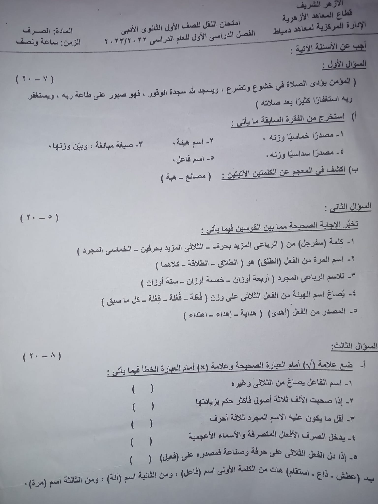 وجاءت نماذج الامتحانات السابقة مادة الصرف الصف الأول الثانوي الأزهري أدبي الترم الأول على النحو التالي: