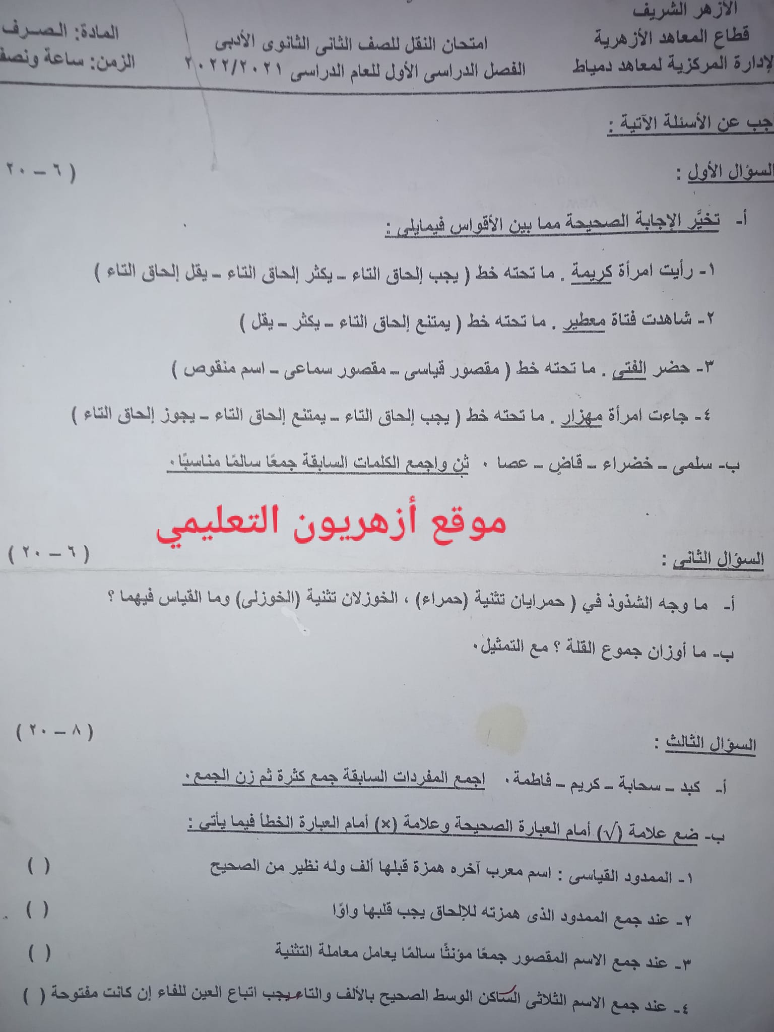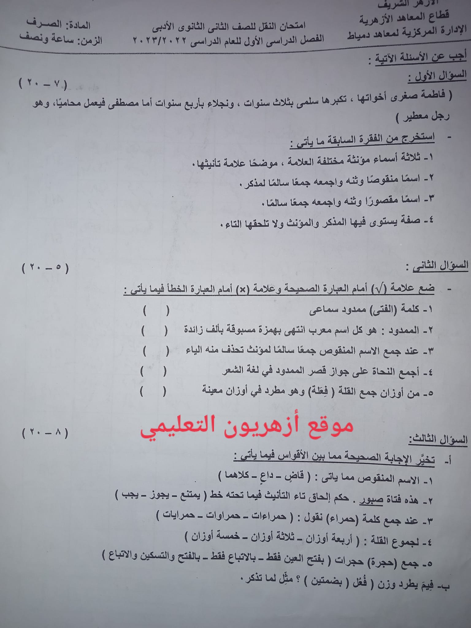 وجاءت نماذج من الامتحانات السابقة مادة الصرف الصف الثاني الثانوي الأزهري الترم الأول أدبي على النحو التالي: