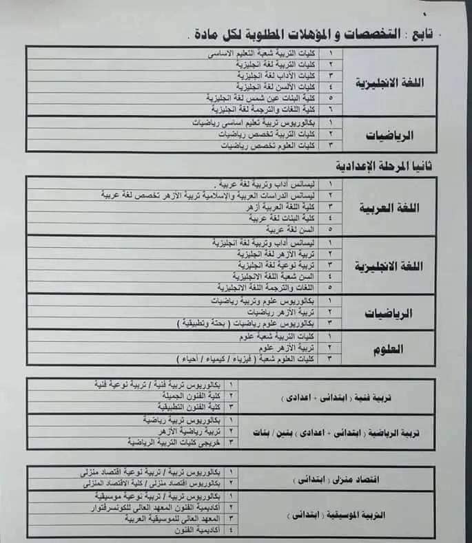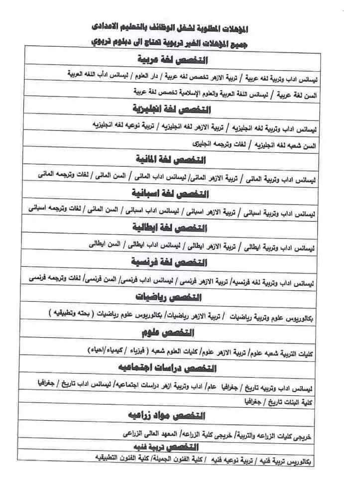 وجاءت المؤهلات المطلوبة في وظائف معلم مادة 2024 المرحلة الإعدادية، على النحو التالي: