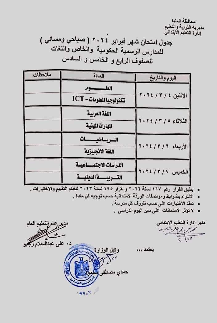 جدول امتحانات فبراير 2024 رابعة وخامسة وسادسة ابتدائي محافظة المنيا