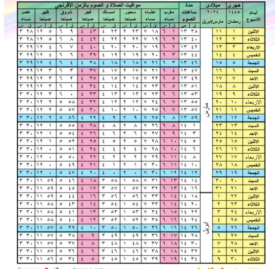 - الاثنين 1 رمضان، 11 مارس 2024، الفجر: 04:43، الظهر: 12:05، العصر: 03:28، المغرب: 06:01، العشاء 07:18.
