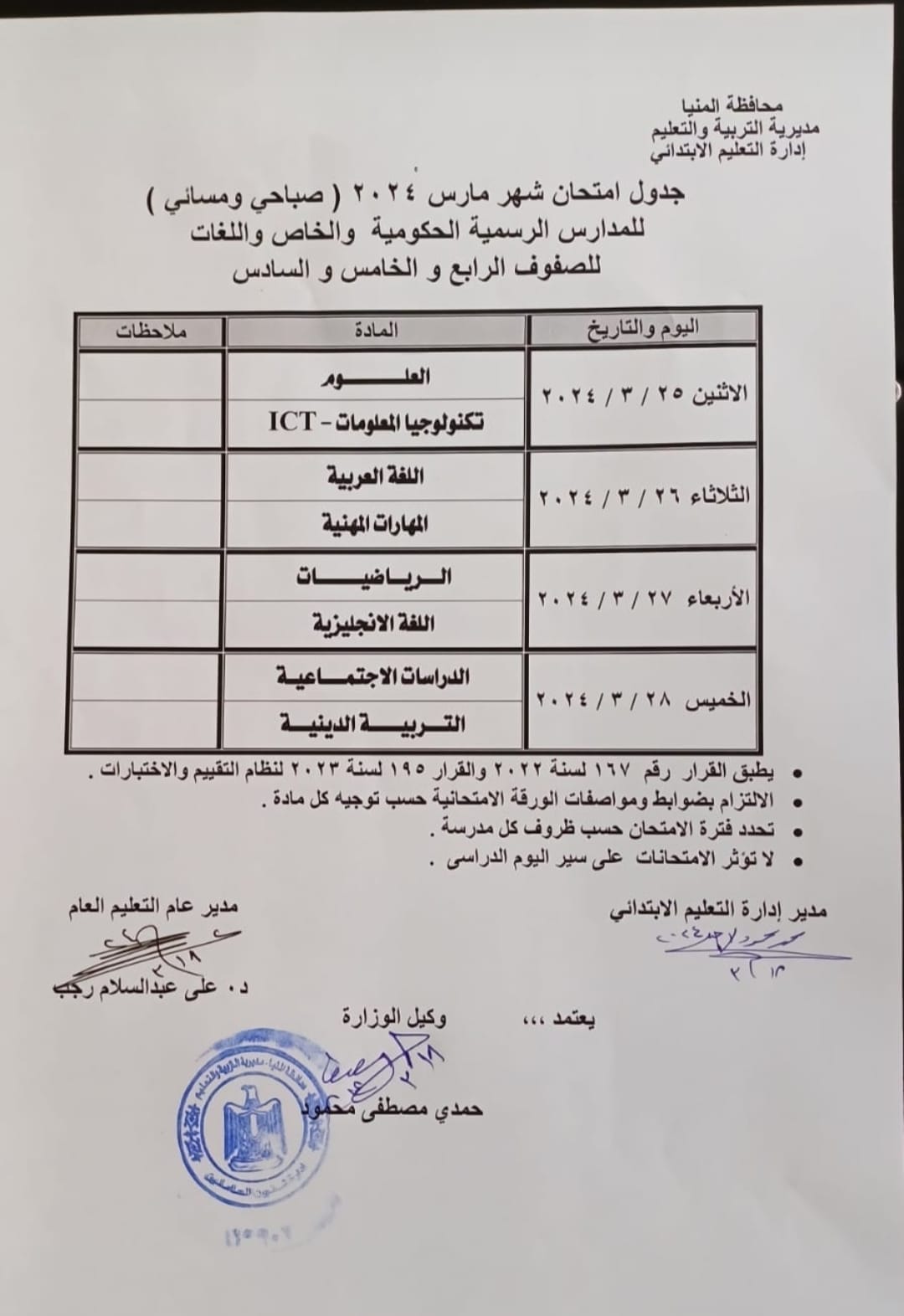 جدول امتحانات شهر مارس 2024 الصف الرابع الابتدائي محافظة المنيا