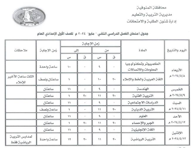وجاء جدول امتحانات الصف الأول الإعدادي الترم الثاني 2024 محافظة المنوفية، على النحو التالي: