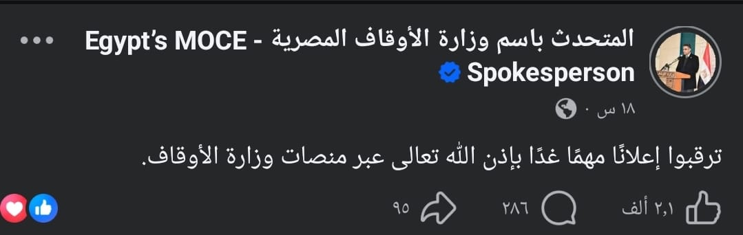 وقد أعلن الدكتور محمد رسلان متحدث وزاة الأوقاف أمس الأحد عن قرارات جديدة قادمة من وزارة الأوقاف، حيث كتب على صفحته على موقع التواصل الاجتماعي "فيسبوك" قائلا: ترقبوا إعلانًا مهمًا غدًا بإذن الله تعالى عبر منصات وزارة الأوقاف.
