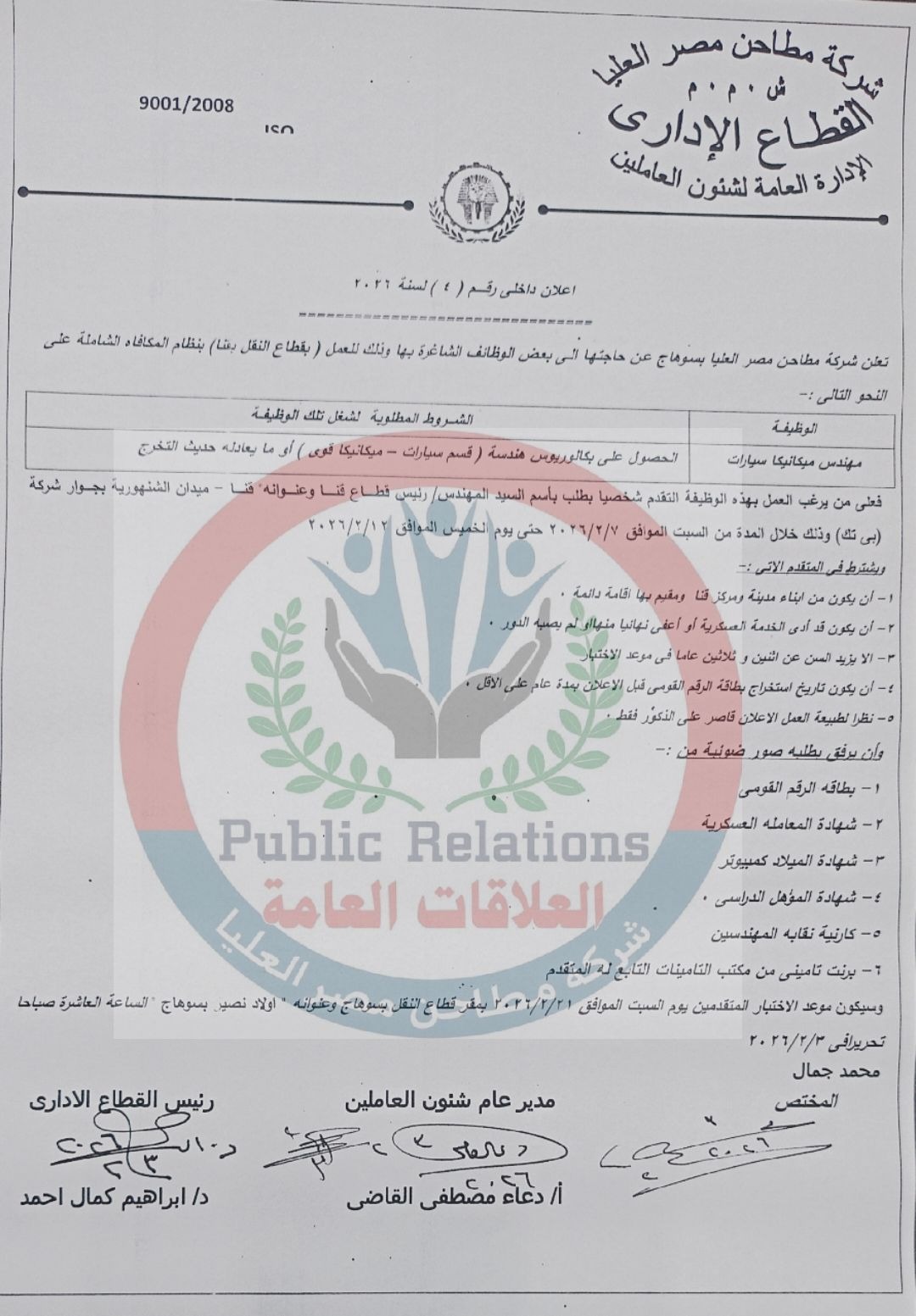فعلى من يرغب العمل بهذه الوظيفة التقدم شخصيًا بطلب باسم السيد المهندس/ رئيس قطاع قنا وعنوانه: قنا – ميدان الشئون – بجوار شركة (…)، وذلك خلال المدة من السبت الموافق 2026/2/7 وحتى يوم الخميس الموافق 2026/2/12.